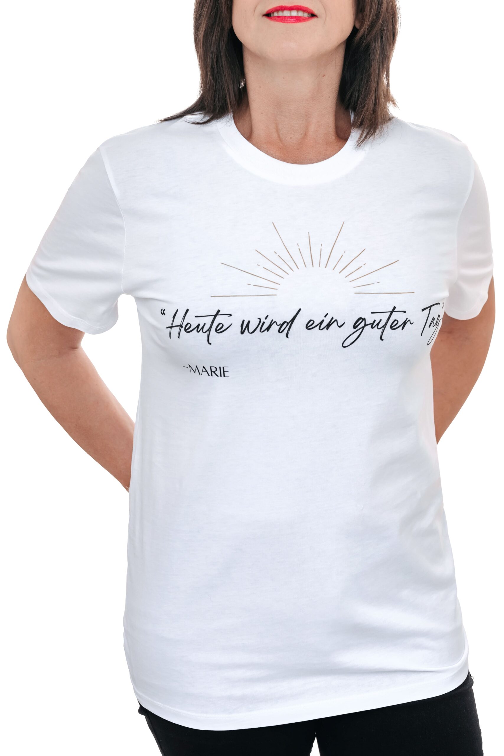 Das T-Shirt überzeugt durch seinen modernen, lässigen Schnitt und das inspirierende Front-Print-Design: ein stilisiertes Sonnenaufgang-Motiv mit dem handschriftlichen Zitat „Heute wird ein guter Tag – Marie“.
