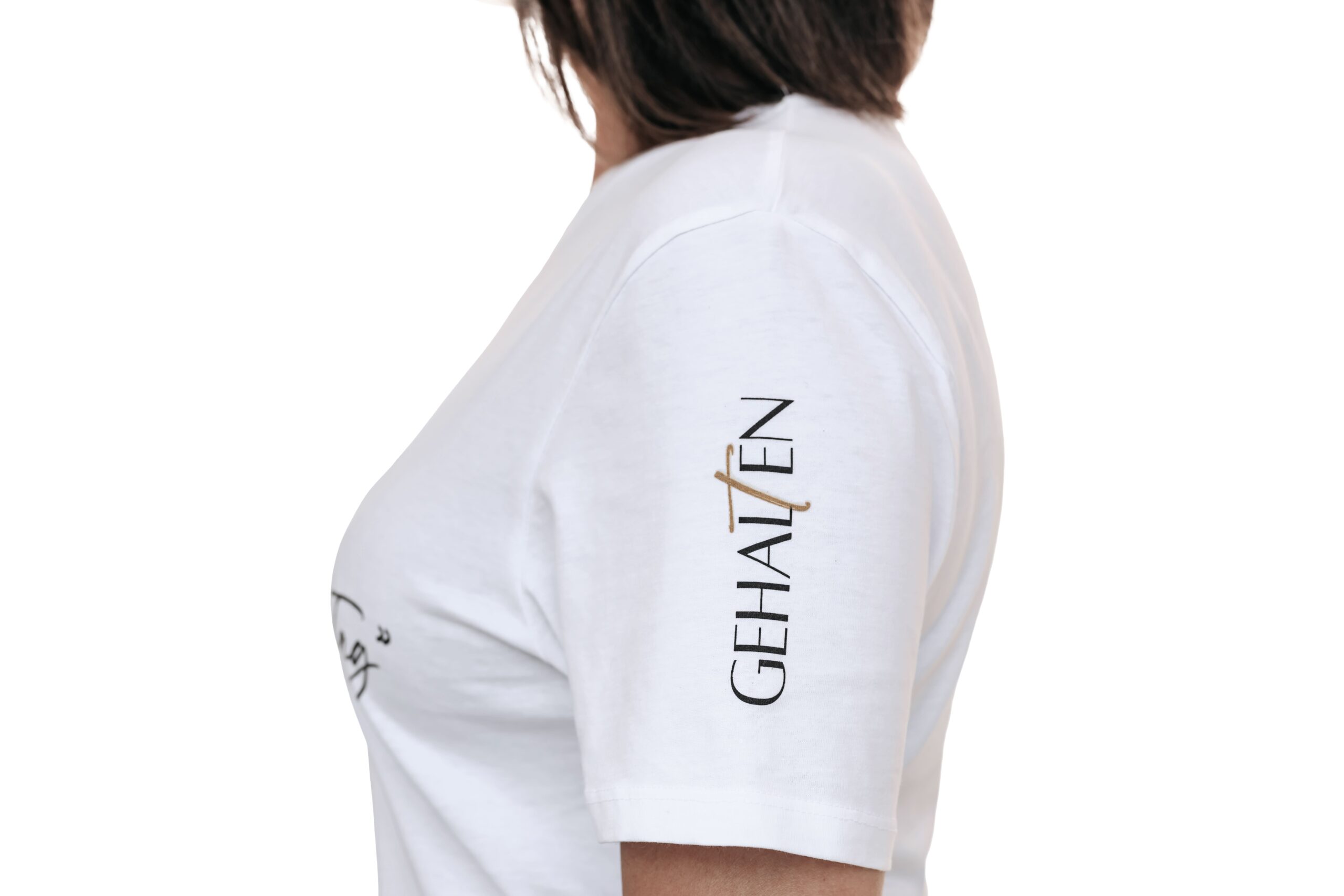 Print: Hochwertiger, langlebiger Siebdruck in Weiß/Gold (bei Schwarz) bzw. Schwarz/Gold (bei Weiß)